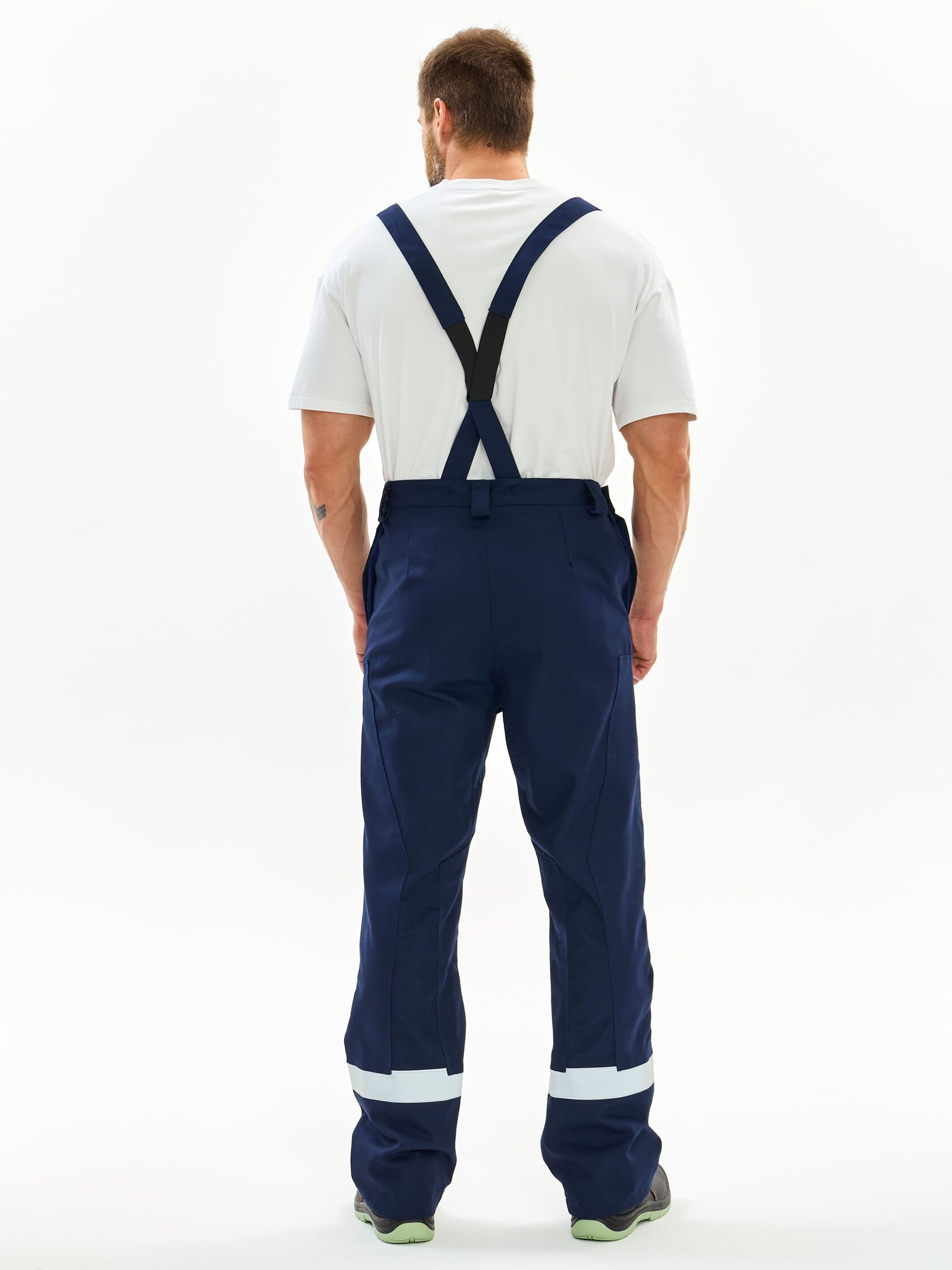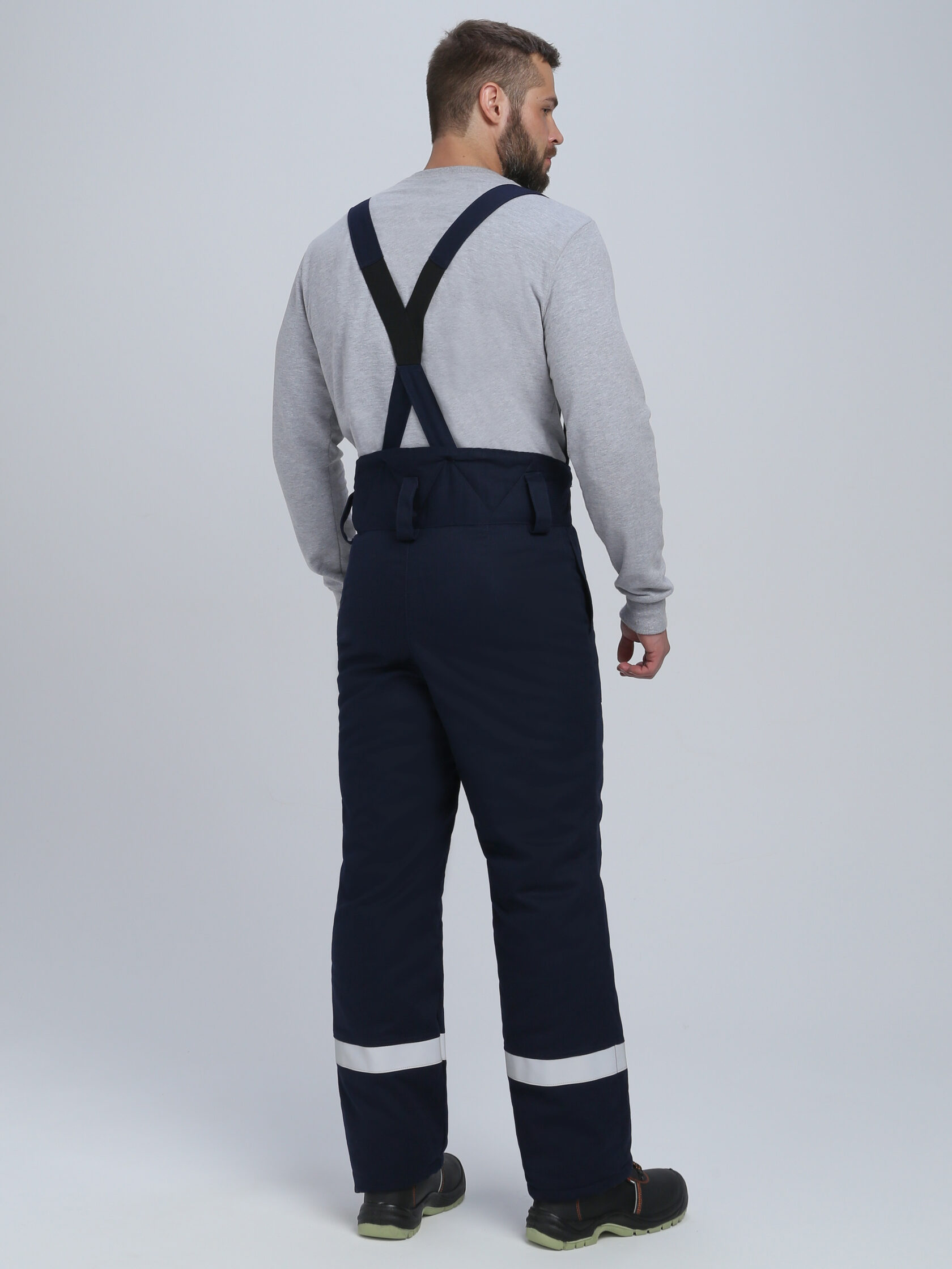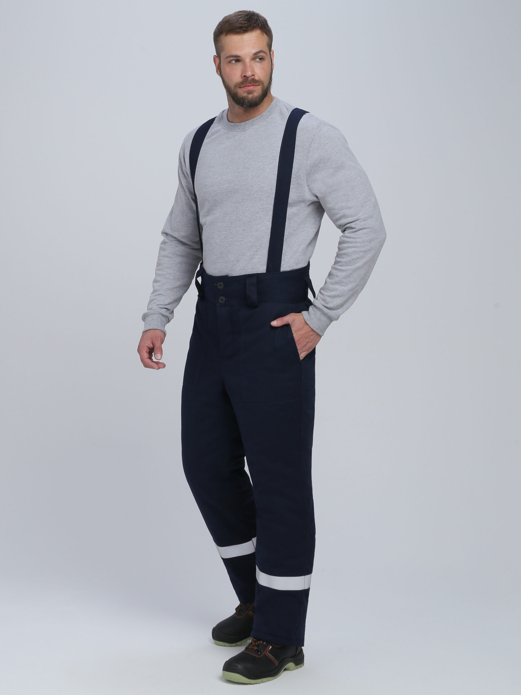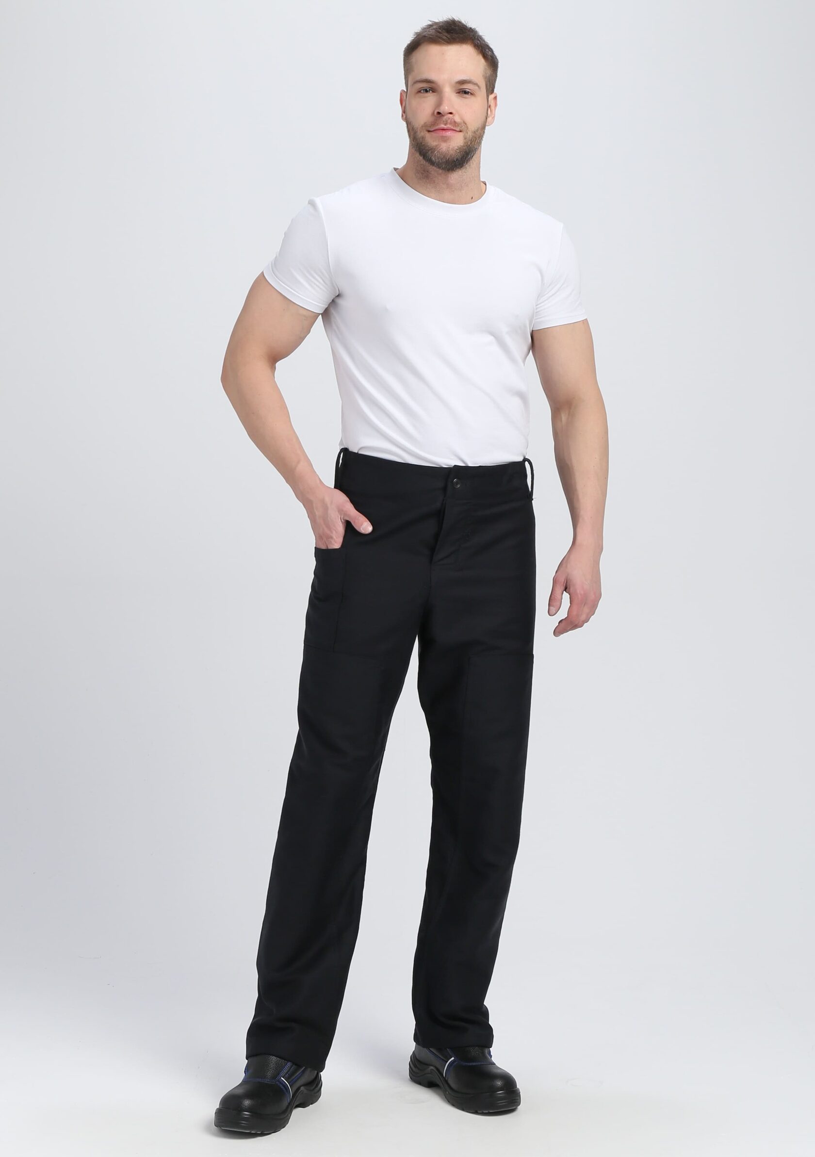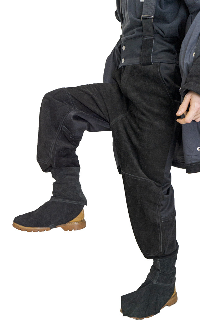 Передняя часть выполнена из плотного подкладочного спилка толщиной 1.2 - 1.4мм, задняя - из огнестойкой ХБ ткани 450 грамм. Нижняя задняя часть брюк также выполнена из спилка, увеличивает срок службы изделия и защищает его от прогорания.