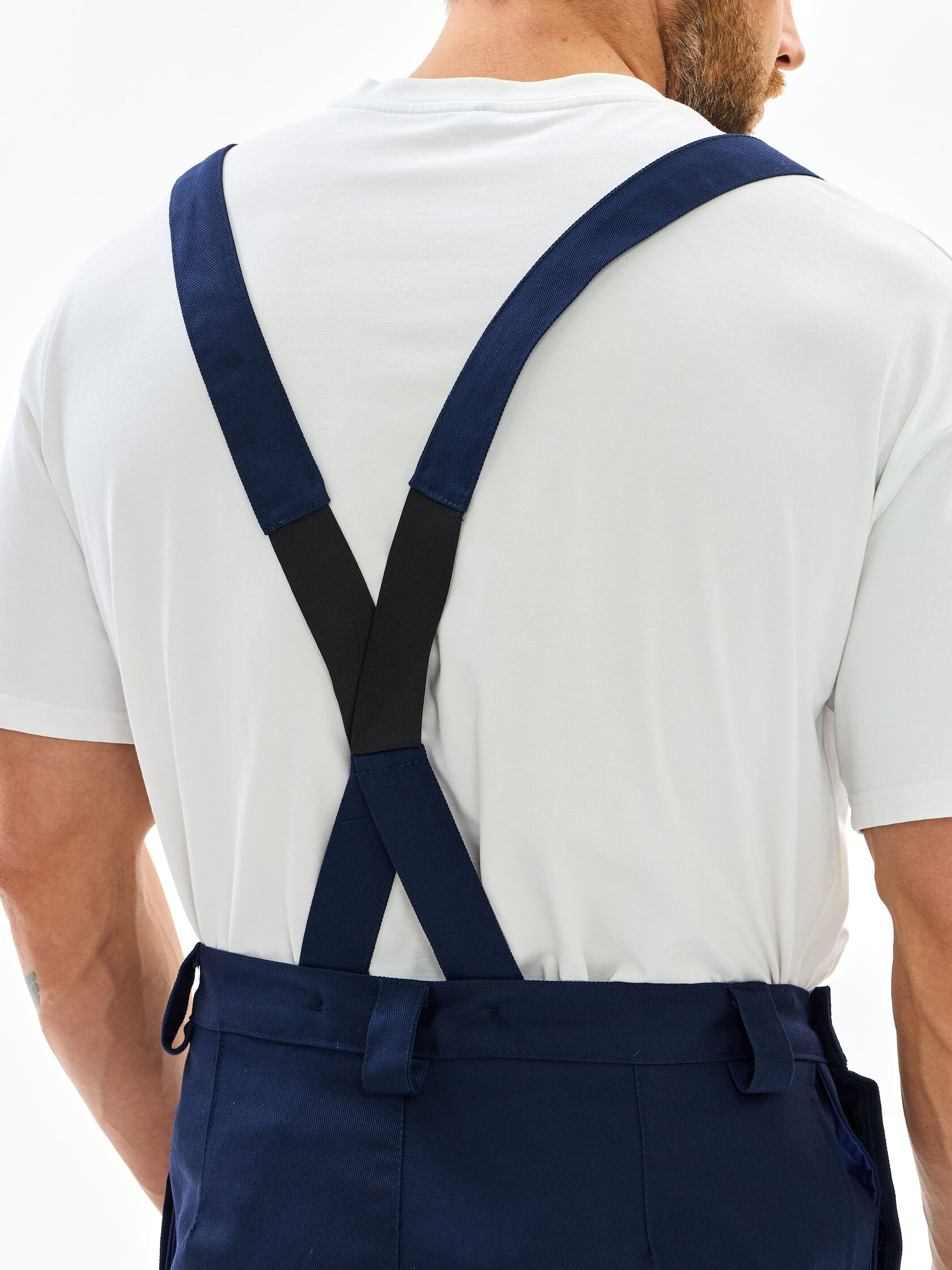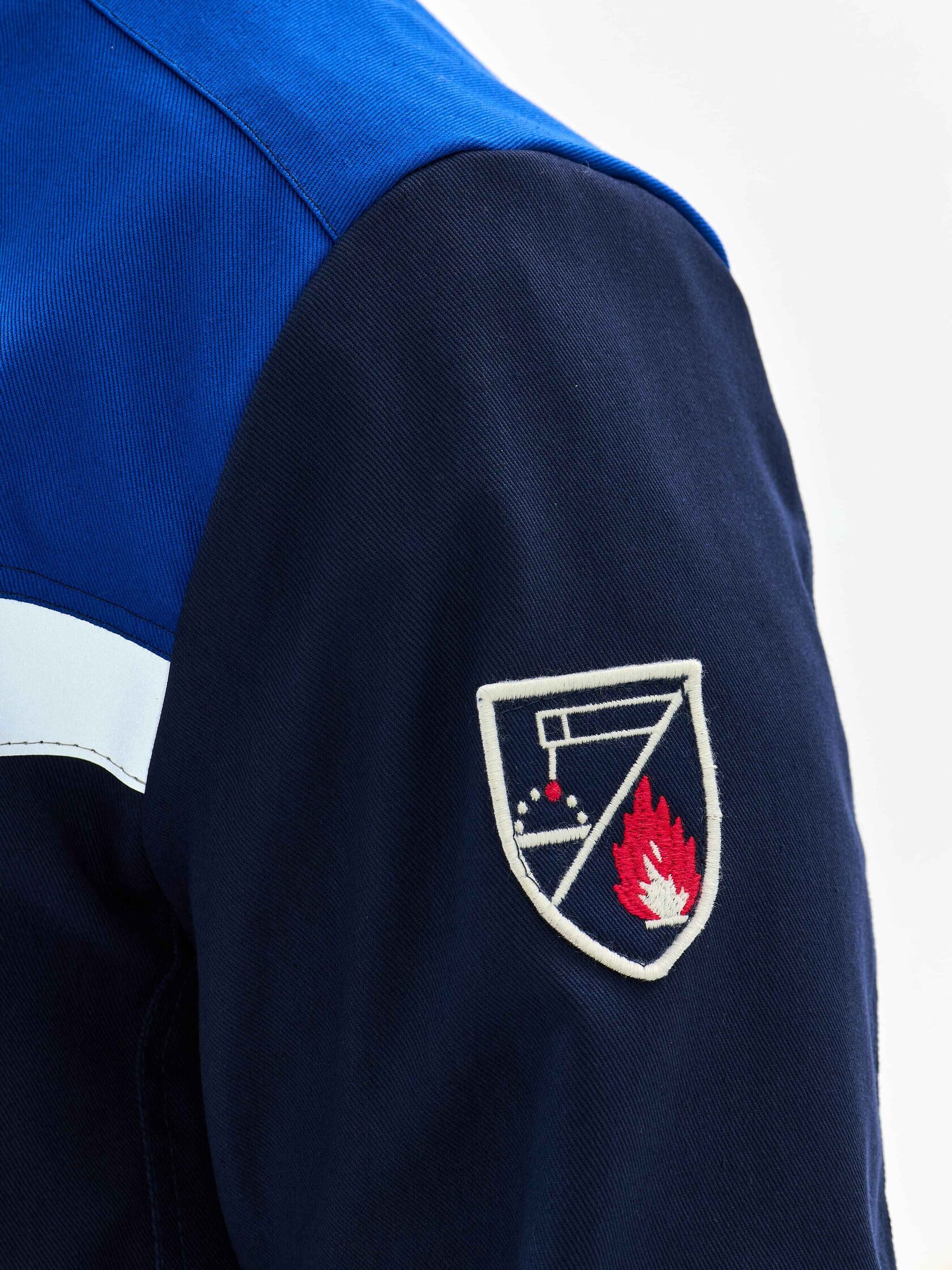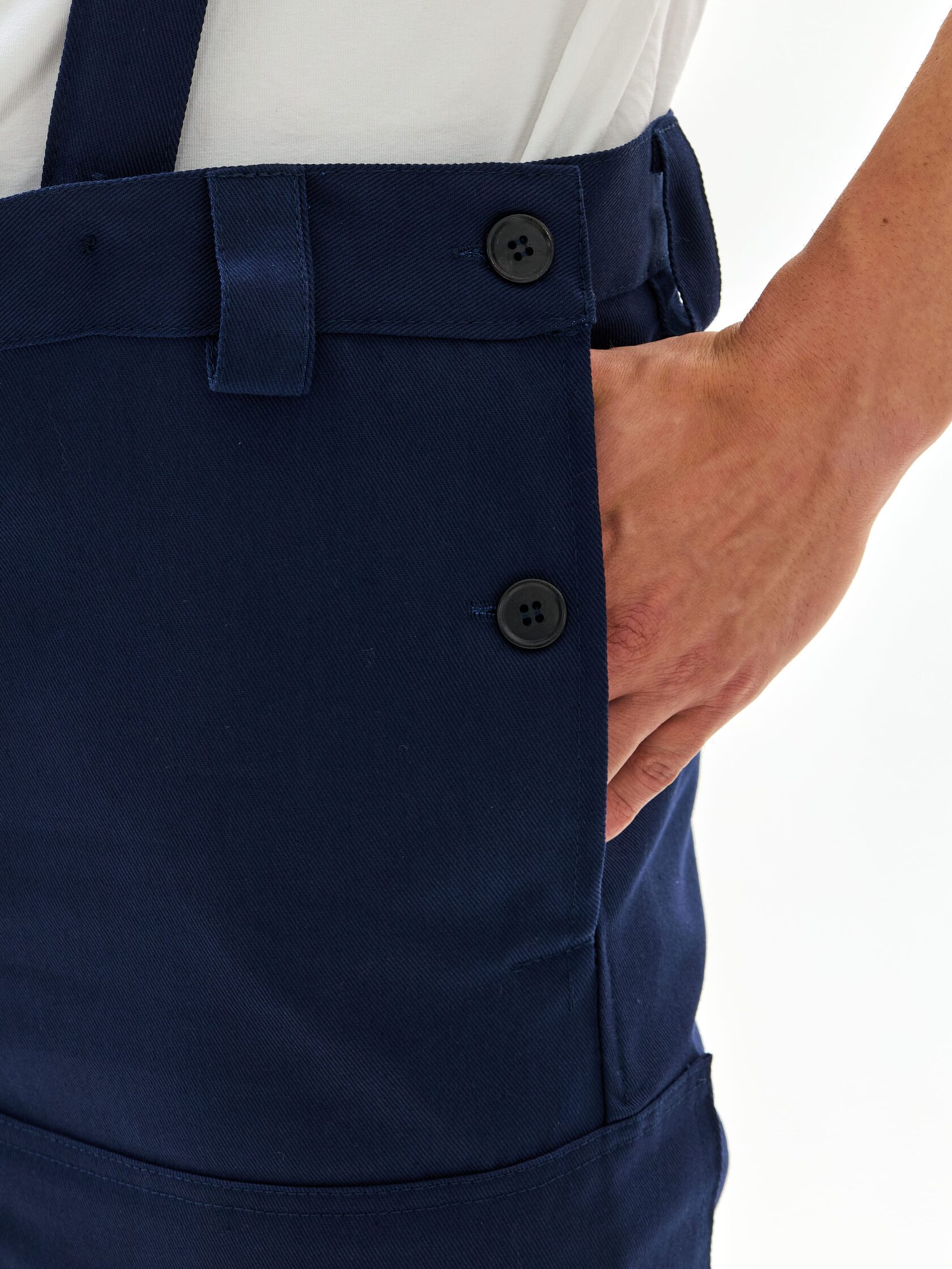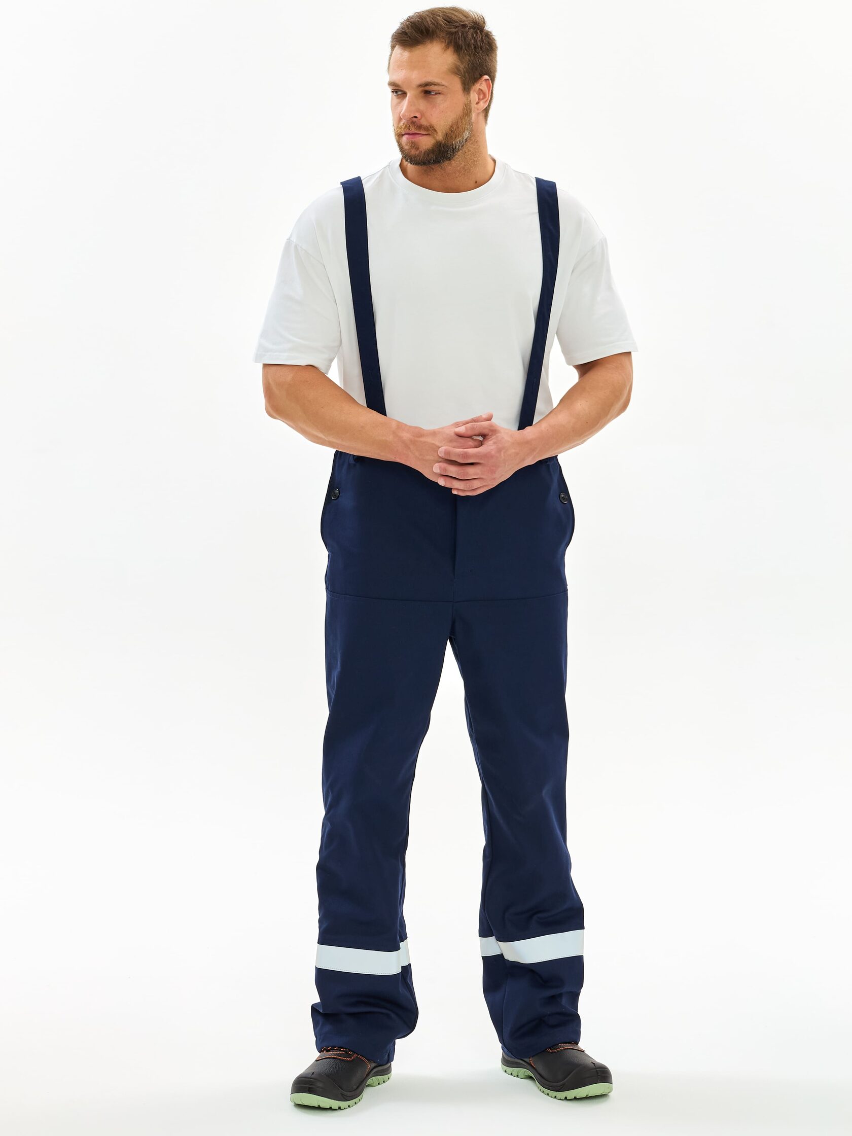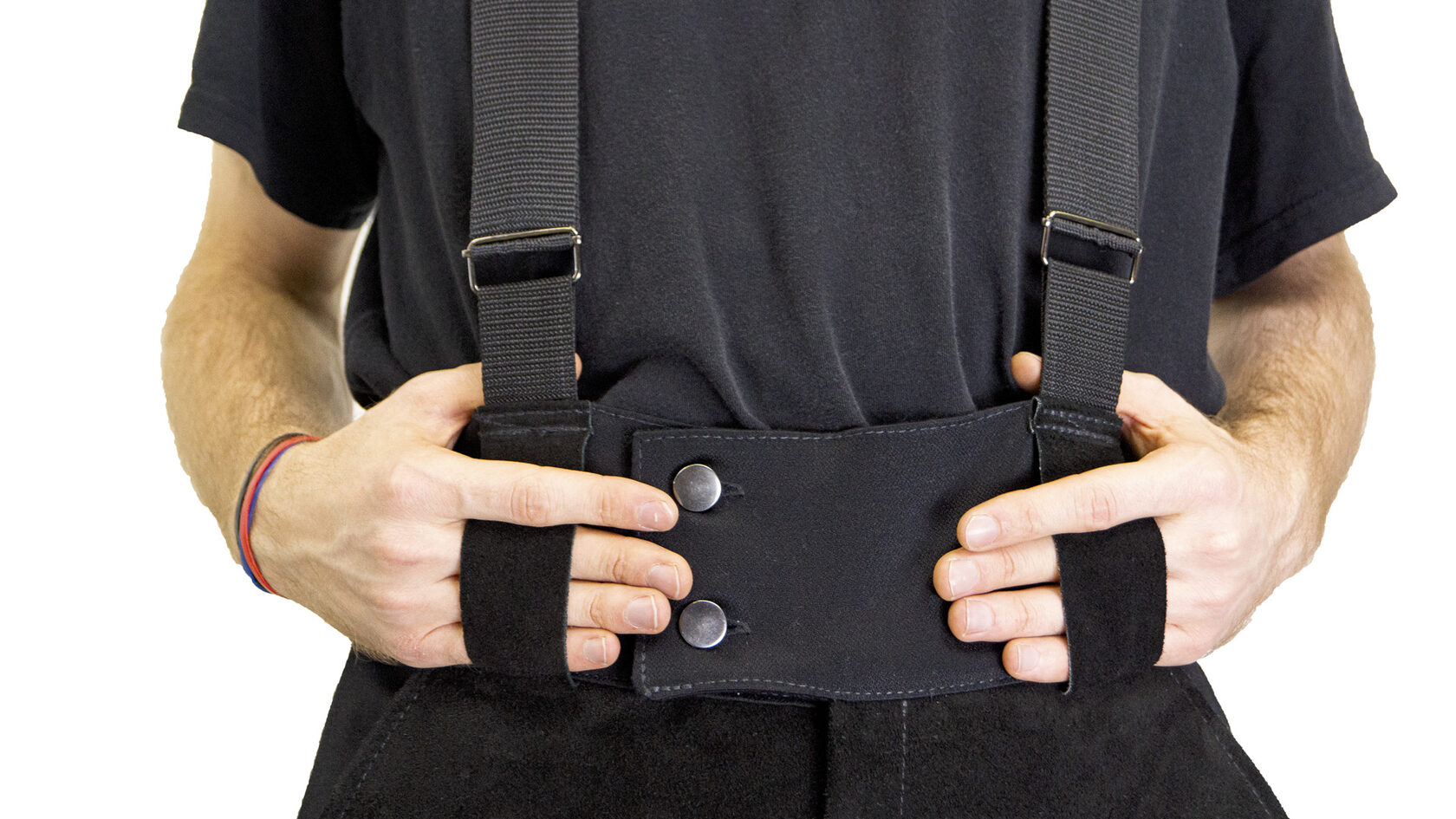 Передняя часть выполнена из плотного подкладочного спилка толщиной 1.2 - 1.4мм, задняя - из огнестойкой ХБ ткани 450 грамм. Нижняя задняя часть брюк также выполнена из спилка, увеличивает срок службы изделия и защищает его от прогорания.