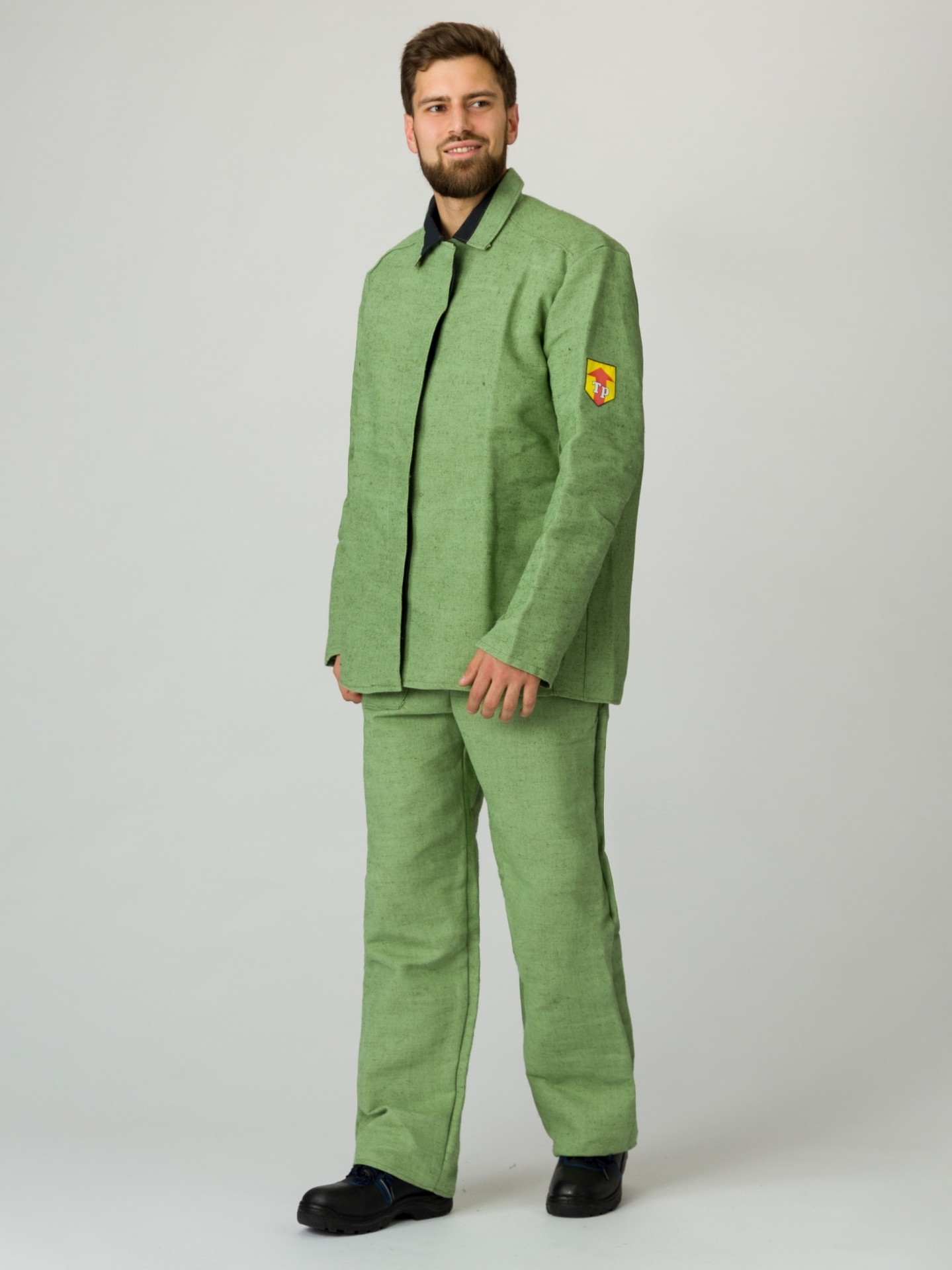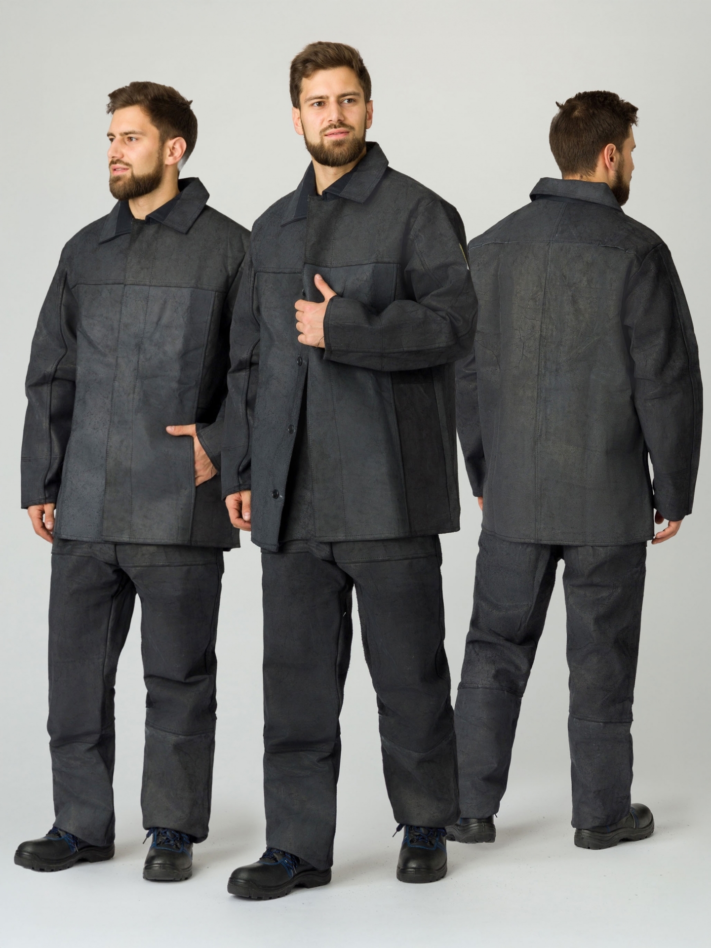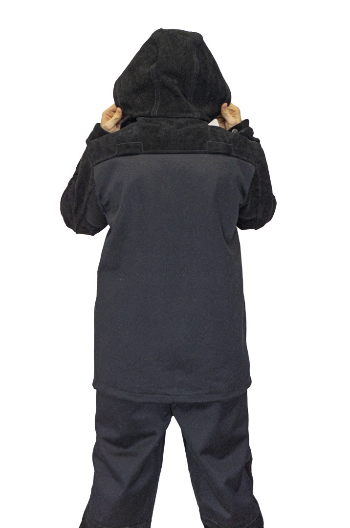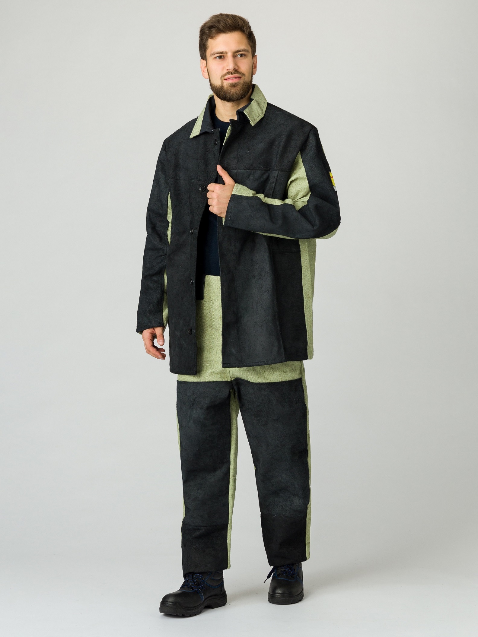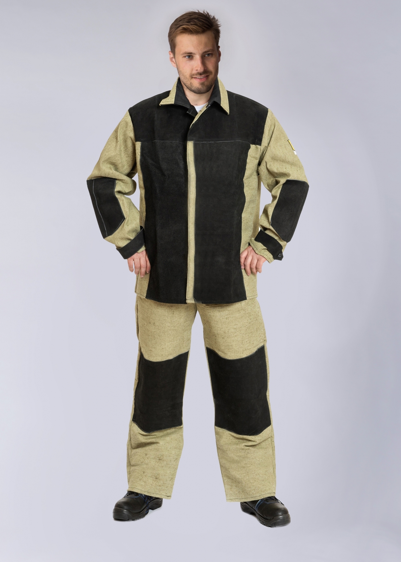 – Имеет вентилирующих клапанов в области спины – Обеспечивает максимальный комфорт и защиту от искр расплавленного – Передняя часть из плотного подкладочного спилка – Усиление локтей и коленей дополнительным слоем спилка – Рукава полностью из спилка –Задняя часть выполнена - из огнеупорной ХБ ткани 450гр. - Куртка комплектуется капюшоном из спилка. - Поясничный отдел закрыт широким поясом – Запах куртки защищен специальным клапаном, молния скрыта спилковой планкой с фиксацией на кнопки. – Защитный клапан в районе запаха куртки – Брюки с утягивающей резинкой на поясе – Нижняя задняя часть брюк из спилка – защищает от прогорания и увеличивает срок службы – Усиленные швы, прошиты арамидной нитью.