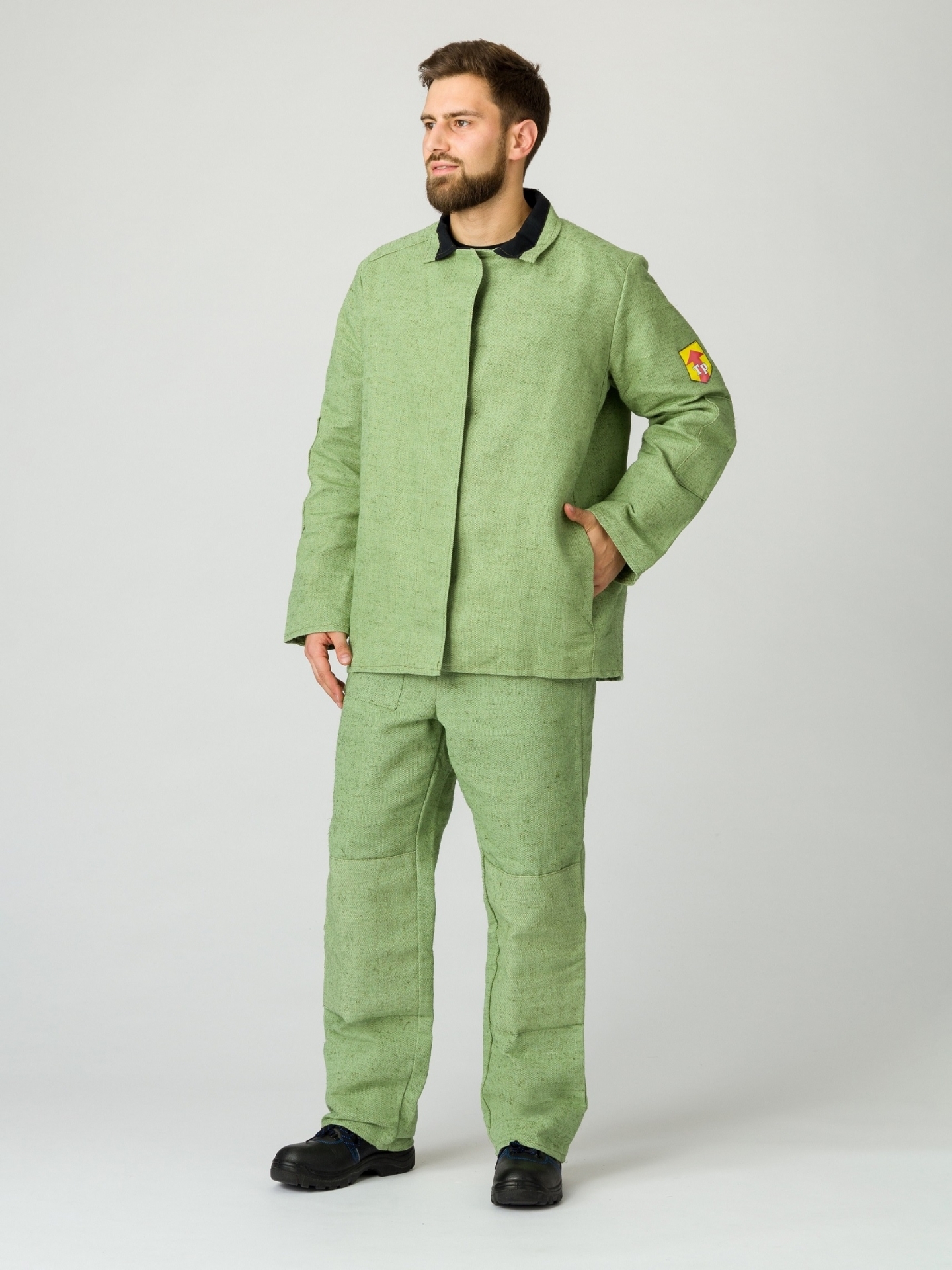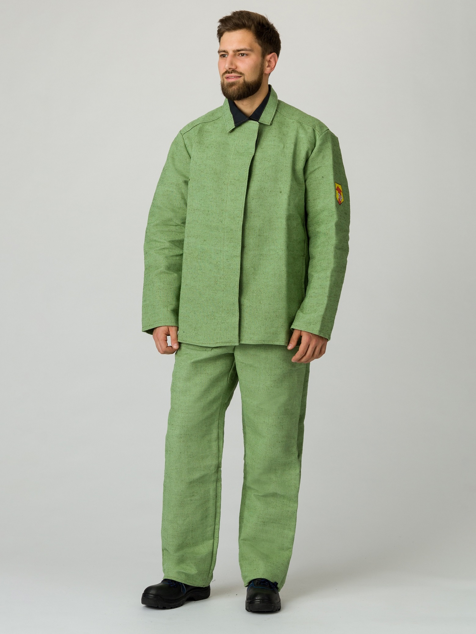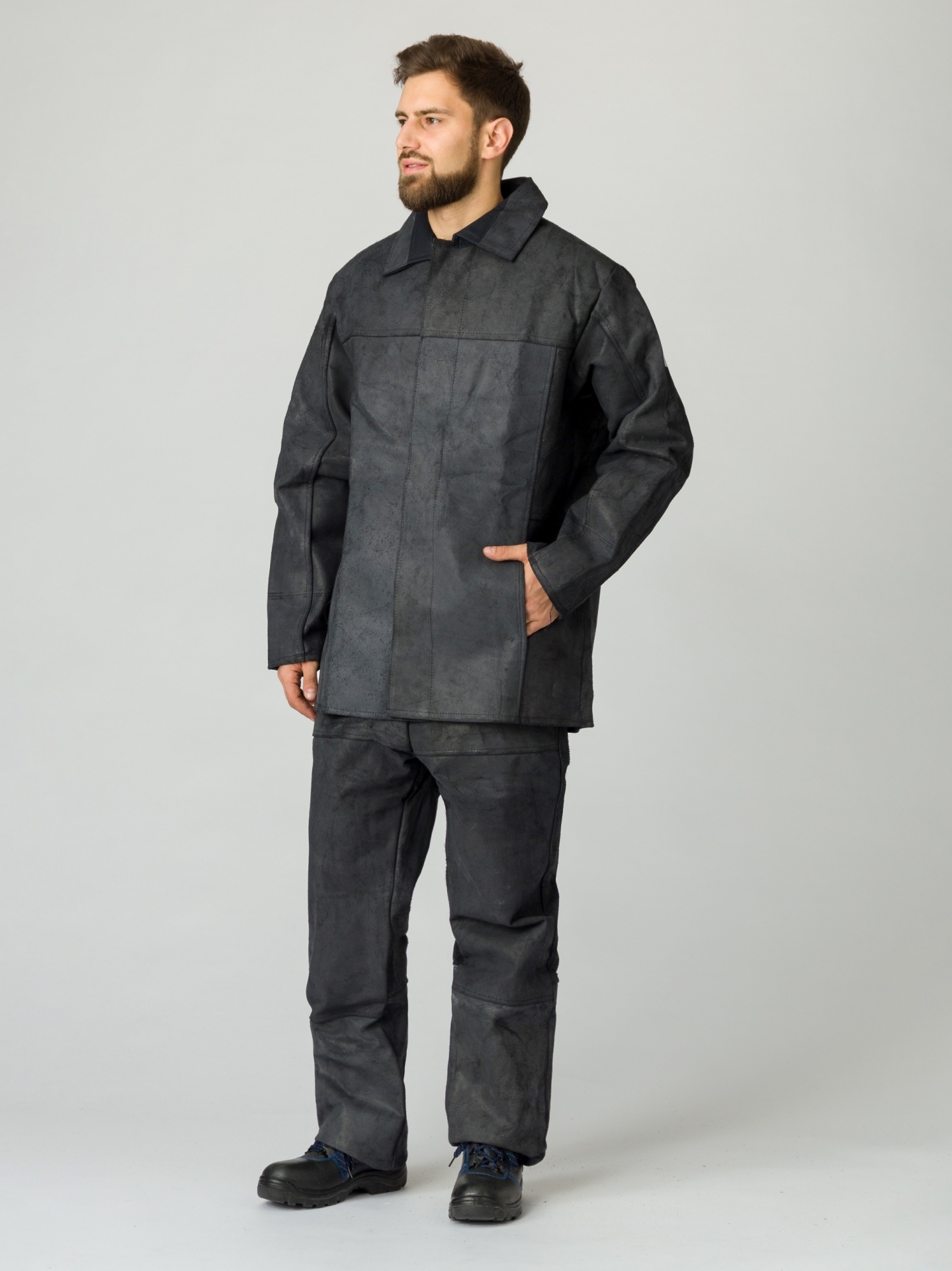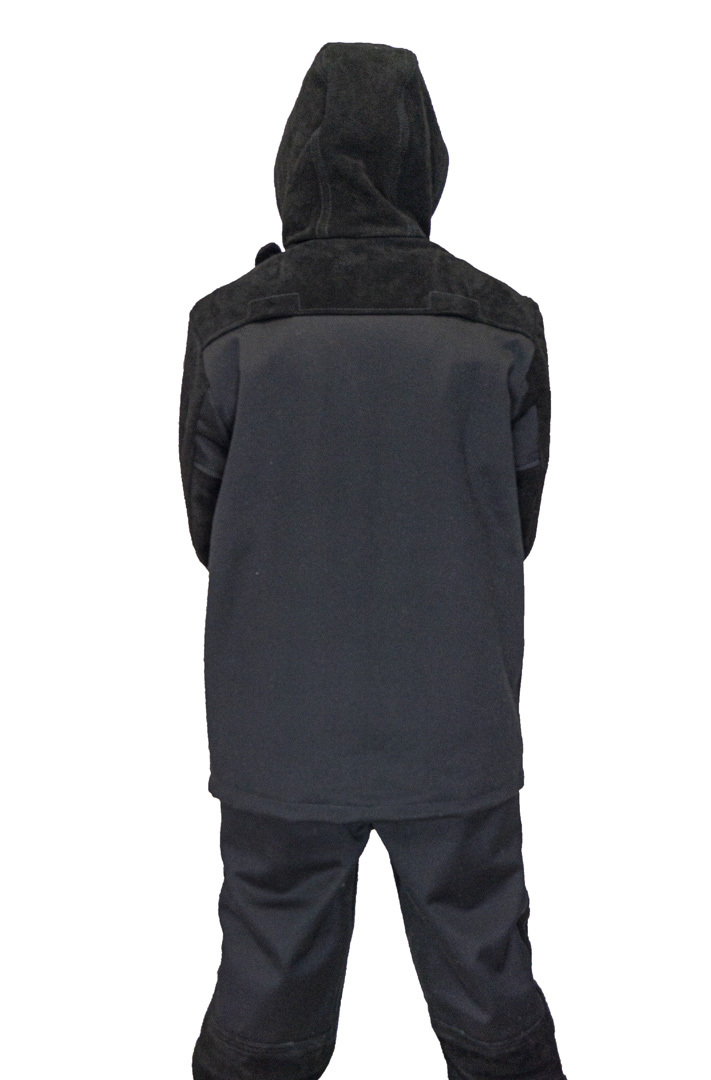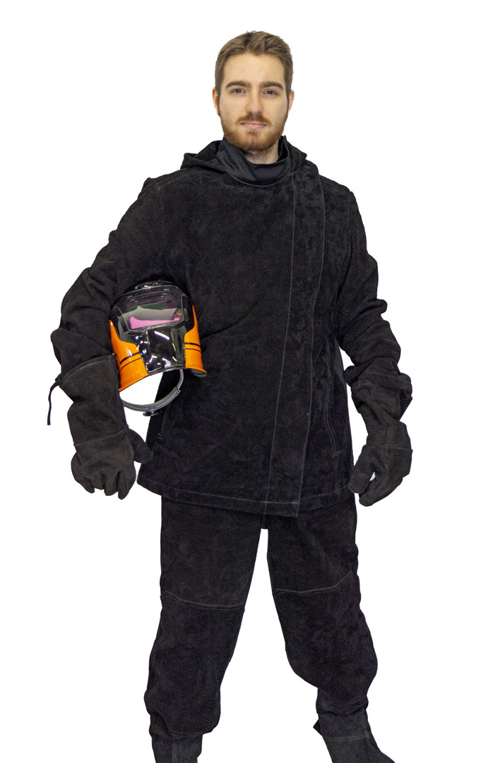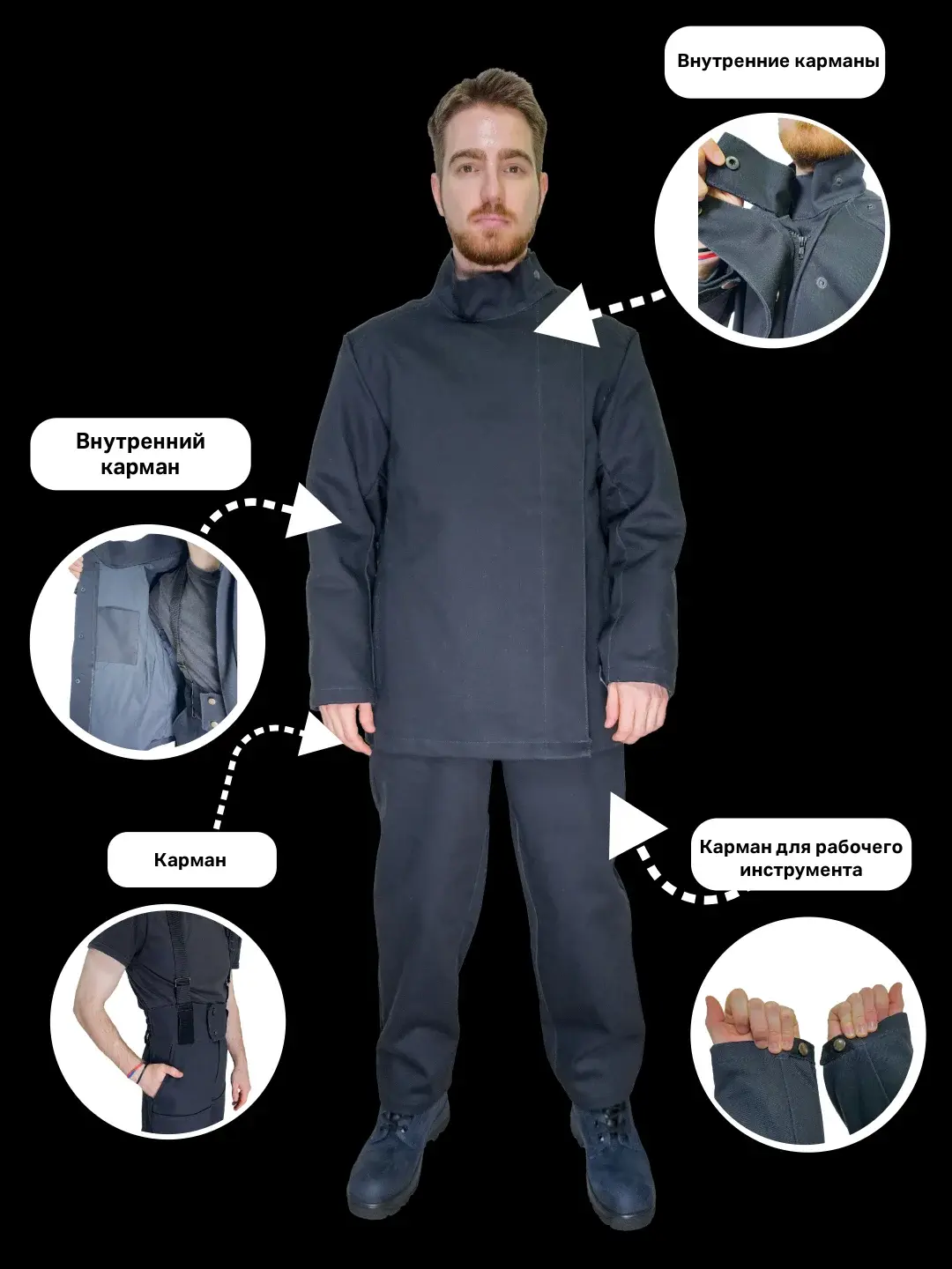 – Имеет вентилирующих клапанов в области спины – Обеспечивает максимальный комфорт и защиту от искр расплавленного – Передняя часть из плотного подкладочного спилка – Усиление локтей и коленей дополнительным слоем спилка – Рукава полностью из спилка –Задняя часть выполнена - из огнеупорной ХБ ткани 450гр. - Куртка комплектуется капюшоном из спилка. - Поясничный отдел закрыт широким поясом – Запах куртки защищен специальным клапаном, молния скрыта спилковой планкой с фиксацией на кнопки. – Защитный клапан в районе запаха куртки – Брюки с утягивающей резинкой на поясе – Нижняя задняя часть брюк из спилка – защищает от прогорания и увеличивает срок службы – Усиленные швы, прошиты арамидной нитью.
