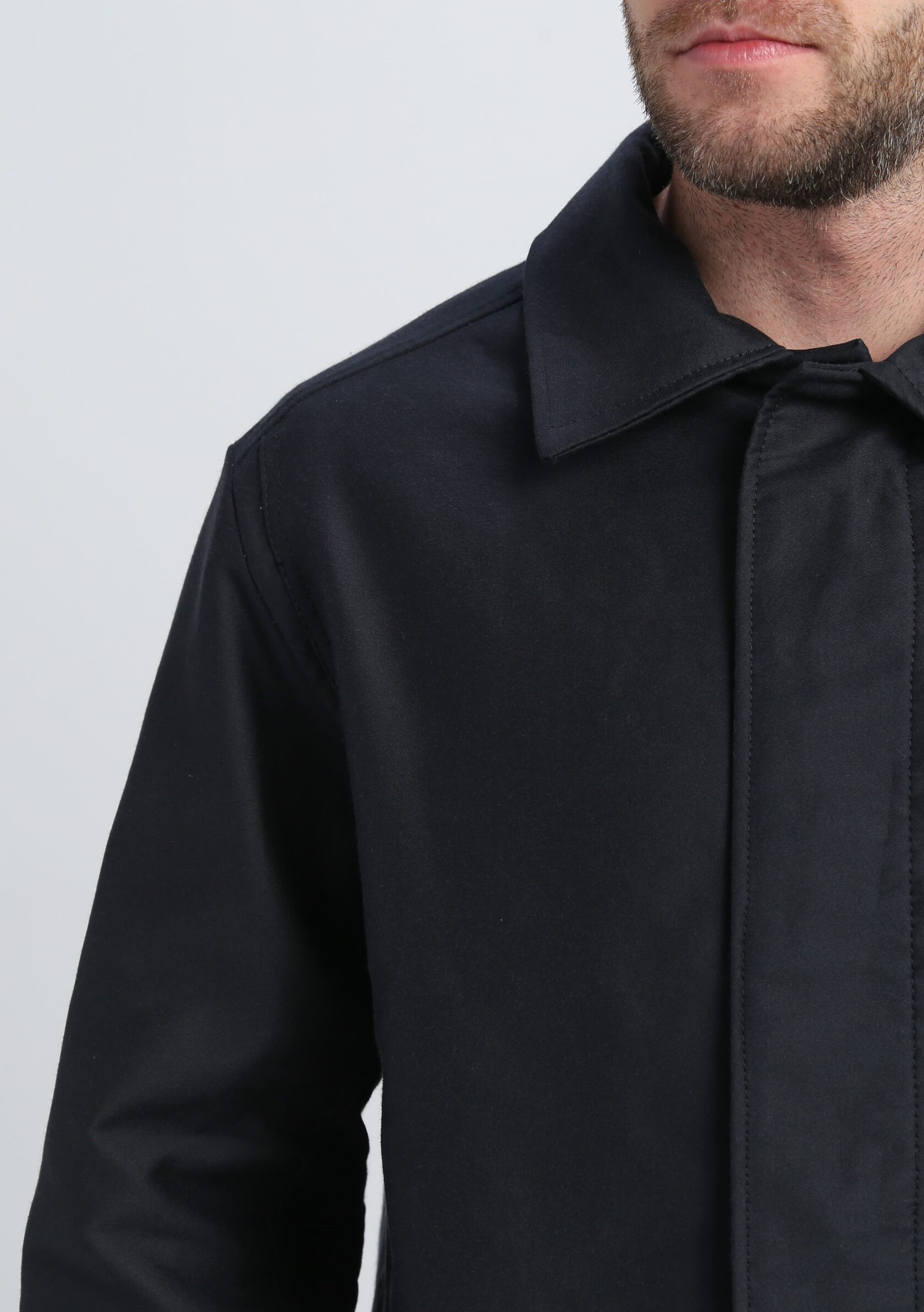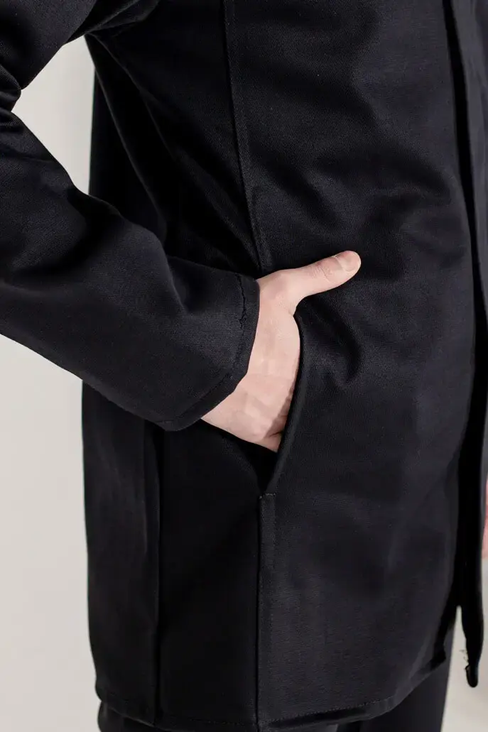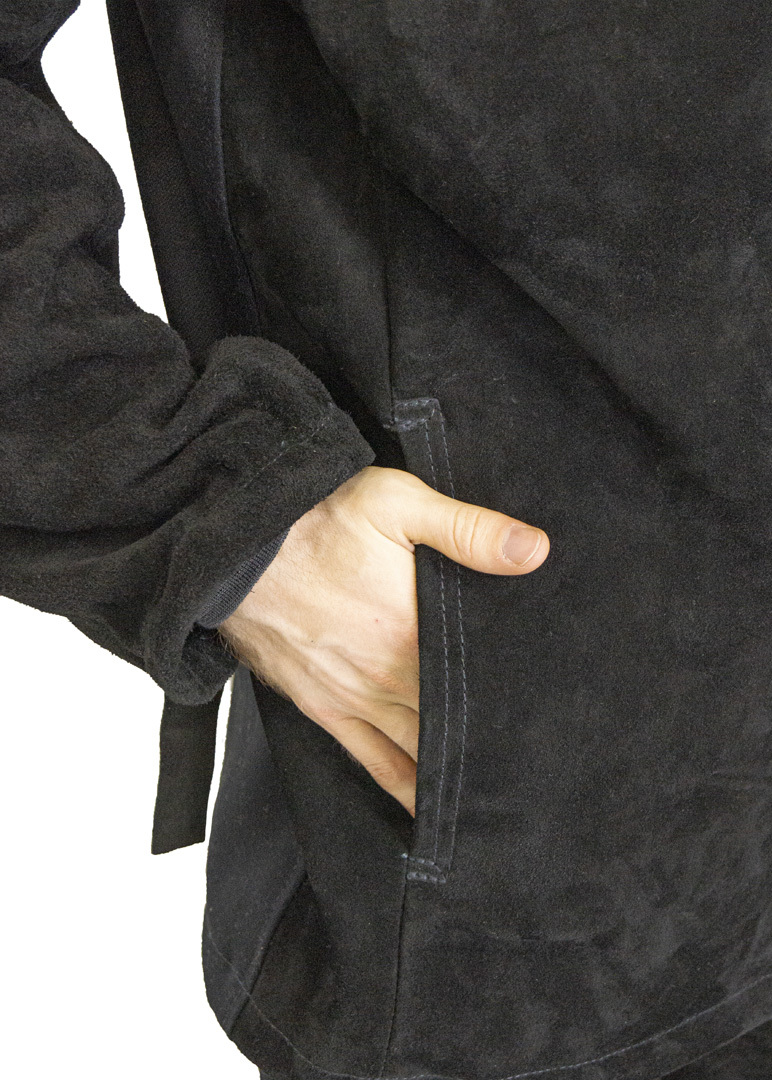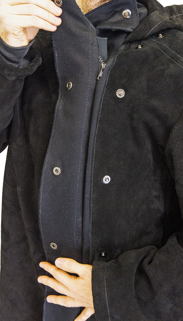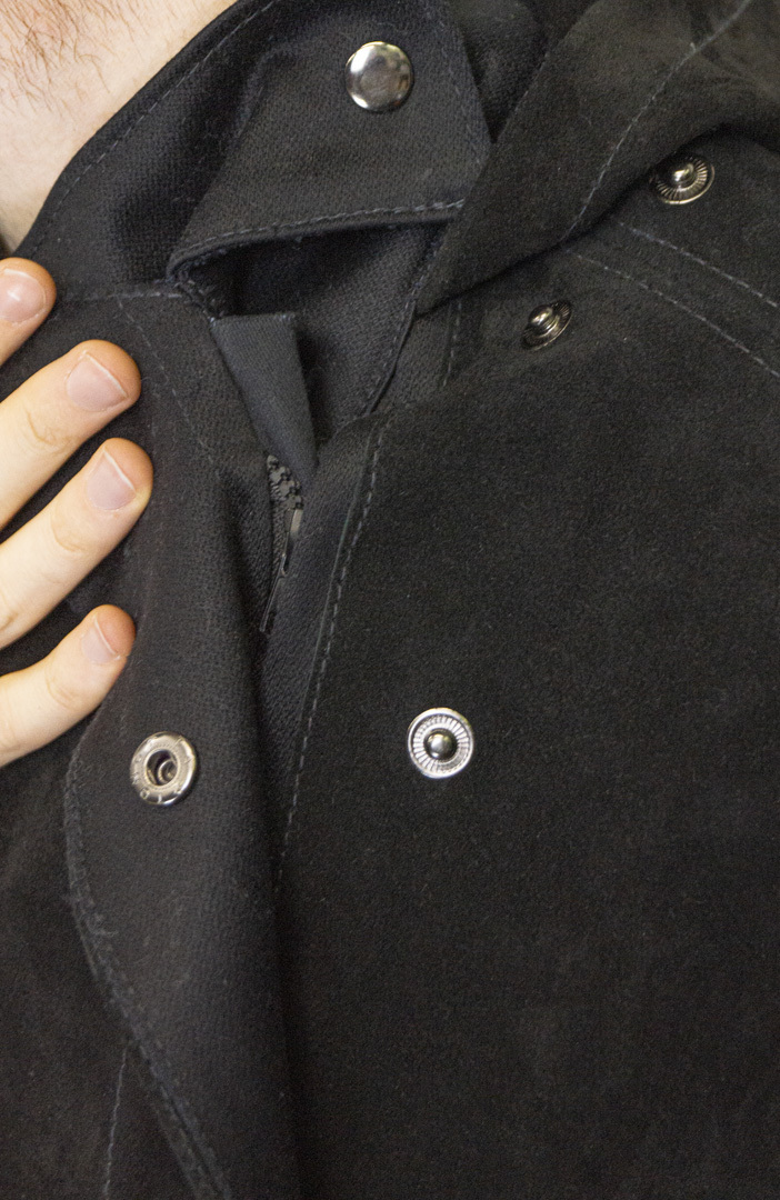 Запах куртки защищен специальным клапаном, молния скрыта спилковой планкой с фиксацией на кнопки.